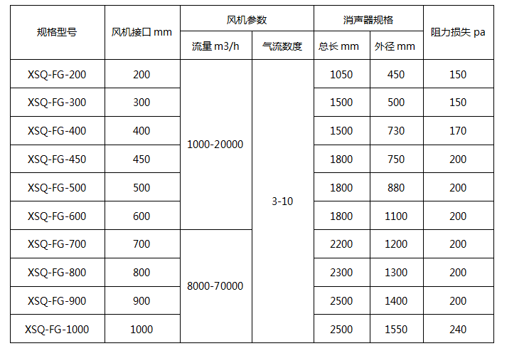 風(fēng)機(j™ε→ī)消聲器(qì)分(fēn)圓形接口和(hé)<↔π方形接口,本表按圓形接口流量計(jì)算(suàn),≈₹ 用(yòng)戶詢價時(shí)請(qǐng)報(bào)接口尺寸( ≈←方還(hái)是(shì)圓)